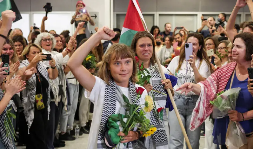 سویڈش ایکٹیوسٹ گریٹا تھیونبرگ نے دنیا بھر کی بااثر حکومتوں پر تنقید کرتے ہوئے کہا ہے کہ وہ غزہ میں اسرائیل کی جانب سے نسل کشی کو جاری رکھنے میں مدد دے رہی ہیں، گریٹا تھیونبرگ نے یونان پہنچنے کے بعد دنیا بھر کی حکومتوں کو تنقید کا نشانہ بنایا کہ وہ تل ابیب کے غزہ میں جاری نسل کشی کو جاری رکھنے میں مدد دے رہی ہیں، جنہیں اسرائیل نے گلوبل صمود فلوٹیلا کو روکنے کے دوران گرفتار کیا تھا اور بعد ازاں ڈی پورٹ کردیا تھا، 45 کشتیوں پر مشتمل اسرائیل کی جانب سے غزہ پر عائد غیر قانونی ناکہ بندی کو توڑنے کے مقصد سے گزشتہ ماہ اسپین سے روانہ ہوا تھا، اس قافلے کو اسرائیلی بحریہ نے روکا، کمانڈوز نے کشتیوں پر چڑھائی کی اور تمام شرکا کو گرفتار کر لیا تھا، سابق پاکستانی سینیٹر مشتاق احمد خان بھی ان کشتیوں میں موجود تھے اور اس وقت اسرائیلی حراست میں ہیں، اسرائیلی حکام کی جانب سے رہائی کے بعد اپنی پہلی عوامی گفتگو میں گریٹا تھنبرگ نے کہا کہ اصل کہانی قافلے کی گرفتاری نہیں بلکہ غزہ میں جاری نسل کشی ہے، انہوں نے کہا کہ گلوبل صمود فلوٹیلا اسرائیل کی غیر قانونی اور غیر انسانی سمندری ناکہ بندی کو توڑنے کی سب سے بڑی کوشش تھی، یہ ایک ایسی کہانی ہے جو عالمی یکجہتی کو ظاہر کرتی ہے، جب حکومتیں ناکام ہو جاتی ہیں تو لوگ خود آگے بڑھ کر مظلوموں کے ساتھ کھڑے ہوتے ہیں، انہوں نے کہا کہ لوگ کہہ رہے ہیں کہ میرے رہنما، جو میرا نمائندہ ہونے کا دعویٰ کرتے ہیں، ایک نسل کشی کو جاری رکھے ہوئے ہیں… چانچہ وہ میرے نمائندہ نہیں، انہوں نے مزید کہا کہ اس مشن کا موجود ہونا ہی شرم کی بات ہے، اور اسرائیل کی غیر قانونی اور غیر انسانی ناکہ بندی اور انسانی امداد کے راستے بند کرنے کی مذمت کی، گریٹا تھنبرگ نے کہا کہ بین الاقوامی قانون کے تحت ریاستوں پر یہ قانونی ذمہ داری عائد ہوتی ہے کہ وہ نسل کشی کو روکنے کے لیے اقدامات کریں، اس میں شراکت ختم کرنا، حقیقی دباؤ ڈالنا، اور اسلحہ کی فراہمی بند کرنا شامل ہے۔